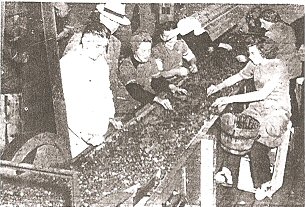 Sixteen women worked steadily all night at the Pacific Co-op plant Monday sorting out part of the largest raspberry crop the district has ever seen. The workers sort out poor berries as the conveyor belt carries the fruit towards a barrel, seen in the foreground. Each belt fills about ten barrels an hour, or about two tons of berries. At the Yarrow Growers' co-op, the process is much the same.