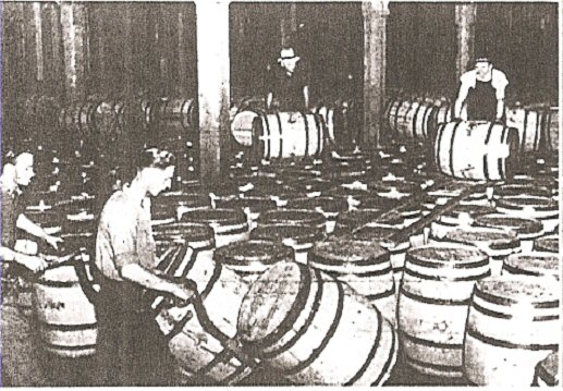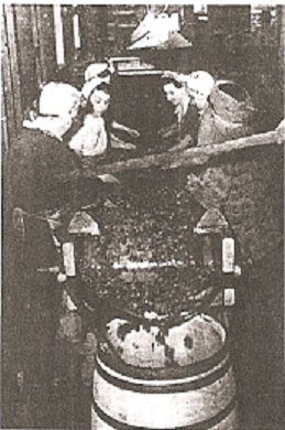George Reimer (in overalls above) foreman at the big Yarrow plant, supervises sorting of the raspberries on one of the six conveyors in the building. J.C. Krause, president of the Fraser Valley Fruit Growers' Federation is shown checking the flow of berries. The barrels containing about 400 pounds of raspberries are filled with SO2 solution and sealed. The Yarrow plant's big storeoom will hold over 2000 barrels.